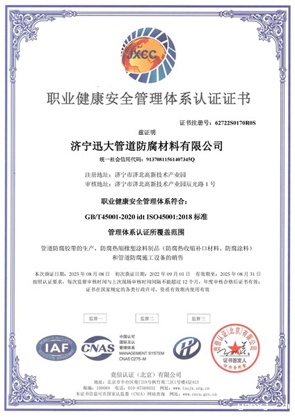 职业健康安全管理体系认证证书